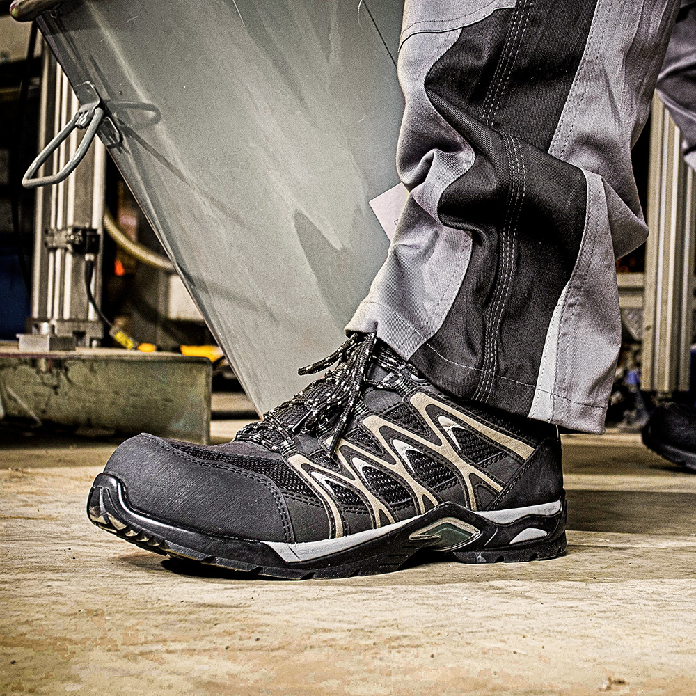 Cross-Terrain Sicherheitsschuh mit den Innovationen aus der Welt des Trekking. Der SILVER RACER XTS LOW mit Fiberglaskappe und metallfreiem, flexiblen FAP®-Durchtrittschutz ist der ideale Sicherheitsschuh für Berufe, in denen viel gelaufen wird, wie z.B. in der Logistik und im Handwerk. Durch den Schaft aus AEROwork Mesh wird der Schuh superleicht und atmungsaktiv, da das offenporige Material für eine optimale Durchlüftung sorgt und Schwitzen minimiert. Seitliche Verstärkungen, verbunden mit dem Schnürsystem, sichern perfekten Halt und Formstabilität. Die strapazierfähige, bis zu 300°C hitzebeständige XTS-Sohle (Cross-Terrain-Sohle) mit verschieden geformten Profilelementen gibt Halt auf unterschiedlichen Untergründen und besitzt selbstreinigende Eigenschaften. In Kombination mit der schockabsorbierenden EVA-Zwischensohle und dem Torsionsschutz-Element zur Unterstützung der Gelenke bei der natürlichen Abrollbewegung des Fußes, bildet die Sohle eine perfekte Einheit aus innovativer Technik und Komfort. Eine Gummibeschichtung im Bereich der Vorderkappe schützt den Schuh gerade bei knieenden Tätigkeiten vor Abnutzung.