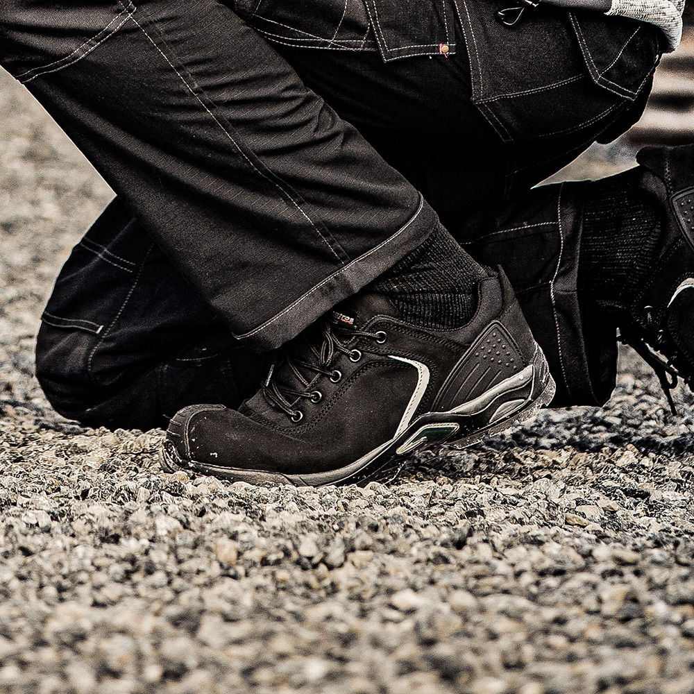 Cross-Terrain Sicherheitsschuh mit den Innovationen aus der Welt des Trekking. Der RUNNER XTS LOW mit Fiberglaskappe und metallfreiem, flexiblen FAP®-Durchtrittschutz ist der ideale Sicherheitsschuh für Berufe, in denen viel gelaufen wird, wie z.B. auf dem Bau oder in der Logistik. Der Schaft aus hochwertigem geöltem Nubukleder ist wasserabweisend und dank der wenigen Nähte leicht zu reinigen. Die strapazierfähige, bis zu 300°C hitzebeständige XTS-Sohle (Cross-Terrain-Sohle) mit verschieden geformten Profilelementen gibt Halt auf unterschiedlichen Untergründen und besitzt selbstreinigende Eigenschaften. In Kombination mit der schockabsorbierenden EVA-Zwischensohle und dem Torsionsschutz-Element zur Unterstützung der Gelenke bei der natürlichen Abrollbewegung des Fußes, bildet die Sohle eine perfekte Einheit aus innovativer Technik und Komfort. Eine hochgezogene TPU-Überkappe an der Schuhspitze schützt ihn gerade bei knieenden Tätigkeiten vor Abnutzung.