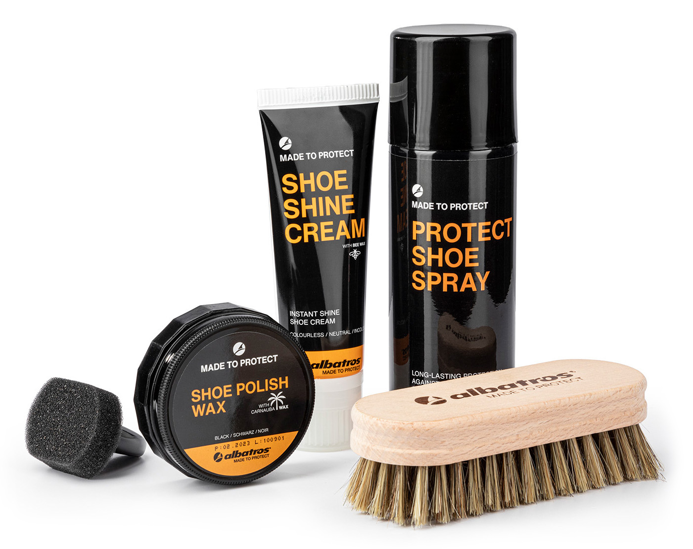 ALBATROS Schuhpflege Komplettset, bestehend aus schwarzem Schuhwachs (50 ml) inkl. Applikator Schwamm, neutraler Instant ShineSchuhcreme (75 ml), Imprägnierspray(200 ml) und einer Schuhputzbürste.